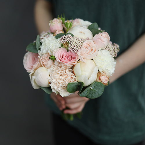 Свадебный букет диантусов, пионов, роз и озатамнуса