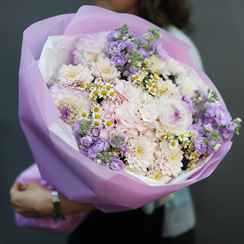 Букет "Сады Версаля" из маттиол, георгин, гортензии и кустовых хризантем