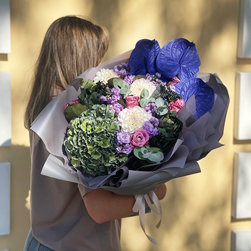 Букет "Сальма" из Голландской гортензии, антуриума, ягод вибирнума, брассики, ароматной маттиолы и георгин