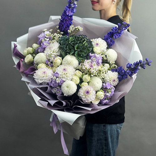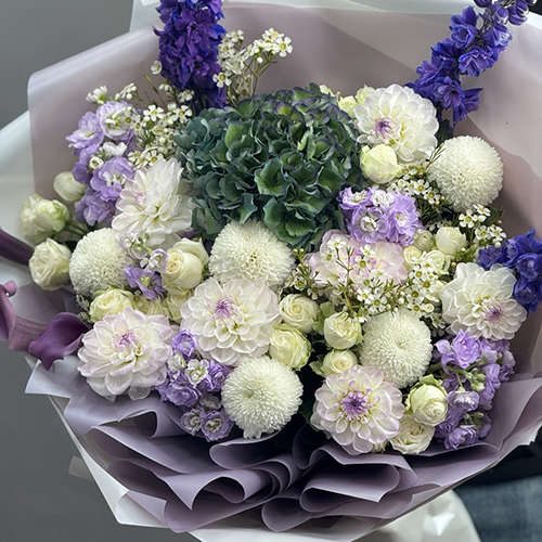 Букет "Поцелуй Джульетты" из Голландской гортензии, георгин, кустовых роз, калл, дельфиниума, ароматных маттиол хризантем Момоко