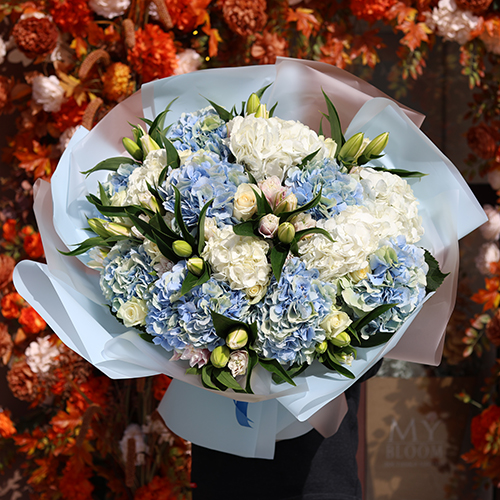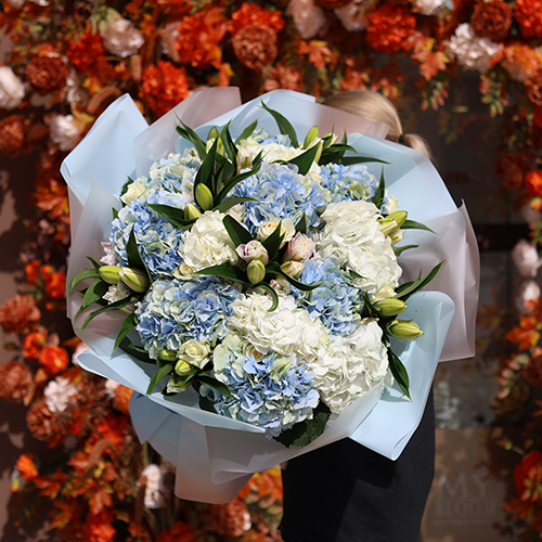 Букет "Елизавета " из гортензий, роз и пионовидных ароматных лилий