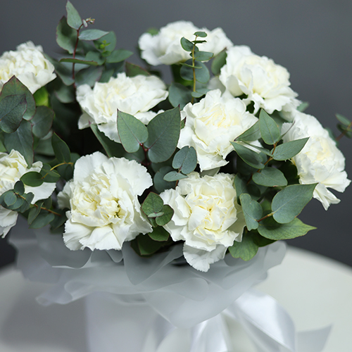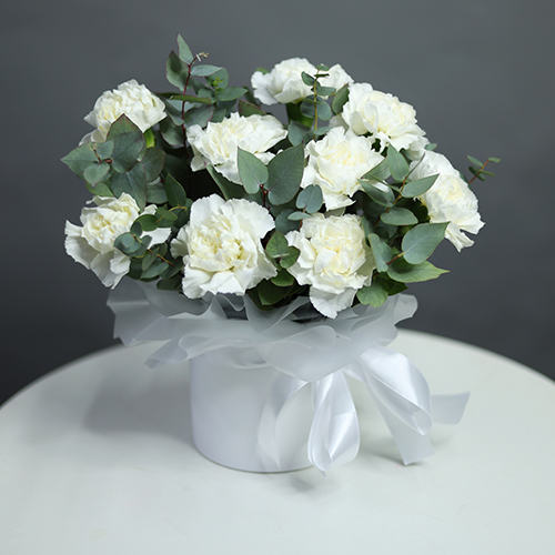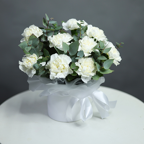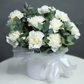Композиция в шляпной коробке из диантусов и эвкалипта