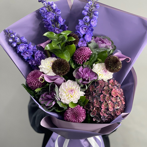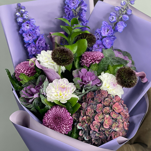 Букет "Лунное затмение" из Голландской гортензии, брассики, георгин, калл, дельфиниума, гербер Экзотик и хризантем Момоко