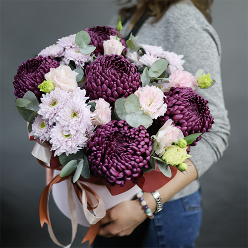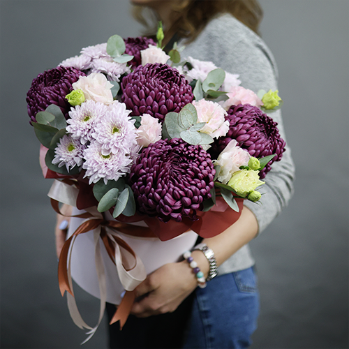 Композиция в шляпной коробке "Наденька" из хризантем Бигоуди, эустом и эвкалипта