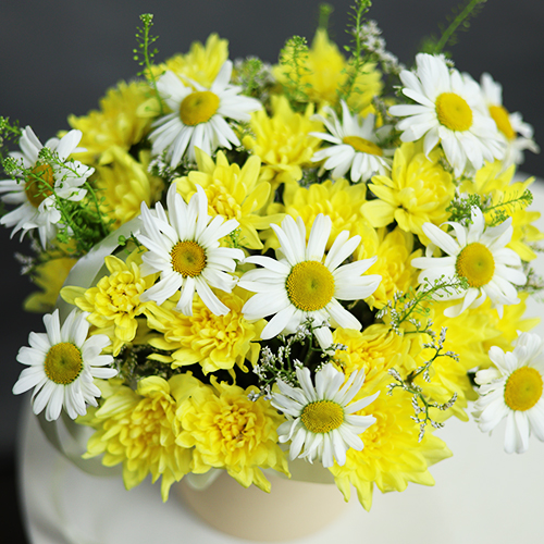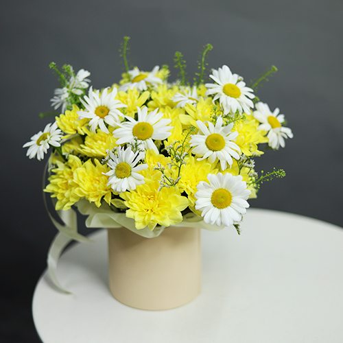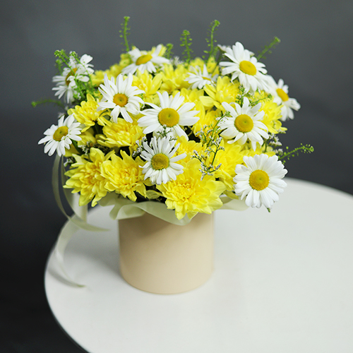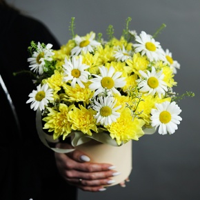 Композиция в шляпной коробке "Витамин D" из ромашек и хризантем