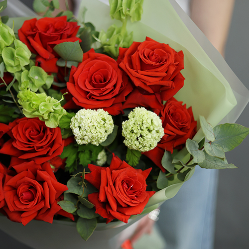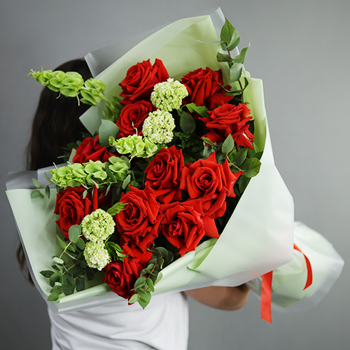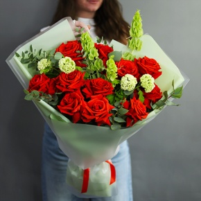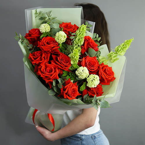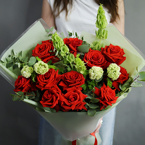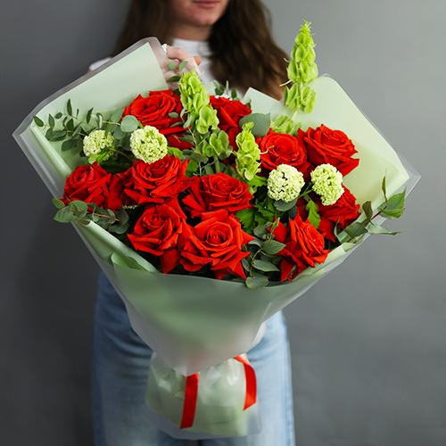 Букет "Унесённые ветром" из роз Эквадор Нина, вибирнума и моллюцелы