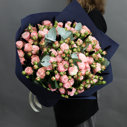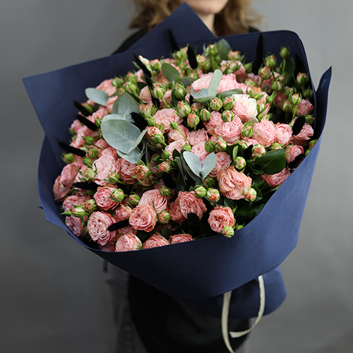 Букет "Спрингфилд" из кустовых роз пионовидных роз Бомбастик, эвкалипта и лагуруса