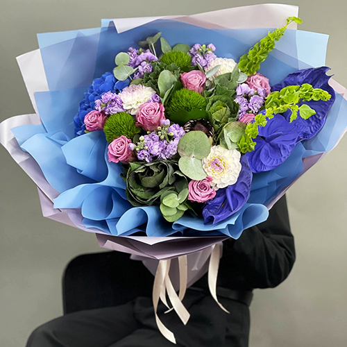Букет "Люкс визаж" из Голландской гортензии, антуриума, диантуса люкс, брассики, ароматной маттиолы, протеи, георгин и моллюцелы