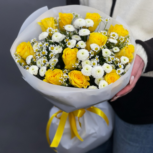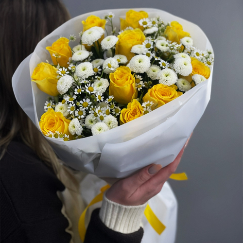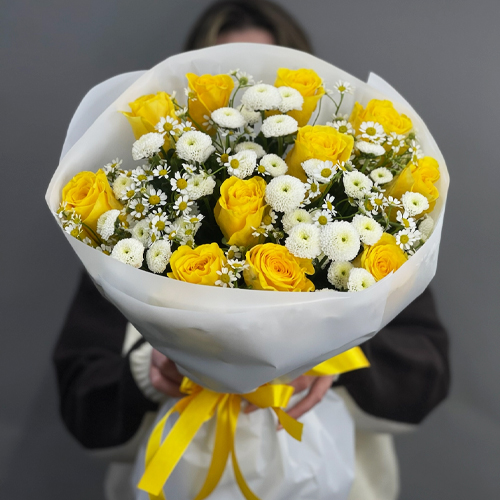 Букет "Синди" из лимонных роз, ромашек и хризантем сантини